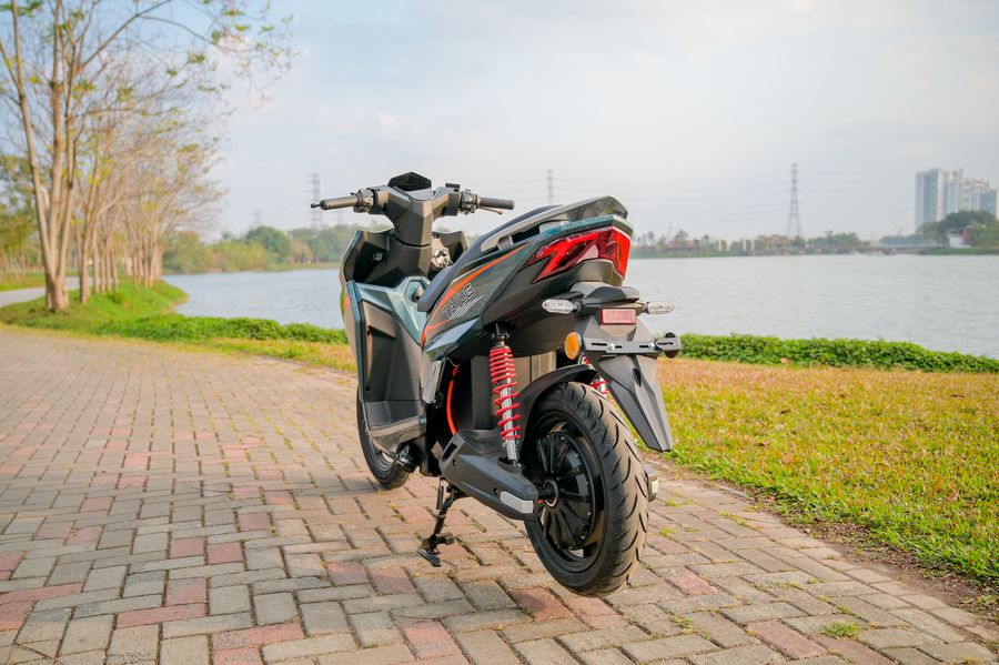 Giảm xóc thủy lực 5 cấp độ hoạt động hiệu quả khi đi qua ổ gà, gờ giảm tốc hay mặt đường xấu. Xe không bị nảy cứng, cũng không bồng bềnh – tạo cảm giác “đầm” đúng chất xe điện công suất cao.